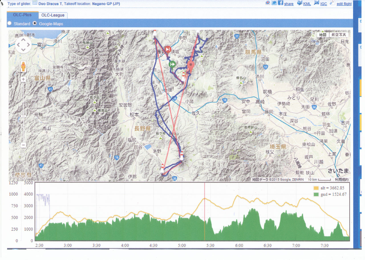 11時26分久しぶりの単座で離陸、ホキヤでベンタス2cTと合流 大松山で2500mまで上げて2cTが烏帽子岳へ向かうのに付いていく、先に行く2cTがサーマルにヒットしない たかが11㎞の谷渡り しかし、ここが肝心、次のサーマルをモノしないと弩ツボに嵌る、1000㎞フライヤーと今スランプの私とでは格が違いすぎるし、数年前の私ならば1発のサーマルをモノにする自信があったし根性もあった、無理をしないで早々に退散、今の自分に合ったコースへ変更 志賀高原を目指す 2時頃SZD55とディスカスが烏帽子で10000ftと無線 八ヶ岳に向かうと 10000を超えれば今の私でも何とかなると 四阿山で3600mまで上げて一気に谷渡り ここでも安全を考慮して蓼科には向かわず美ヶ原を目指す その後は3000m超えの長野へいつでも帰れるローカル飛行
