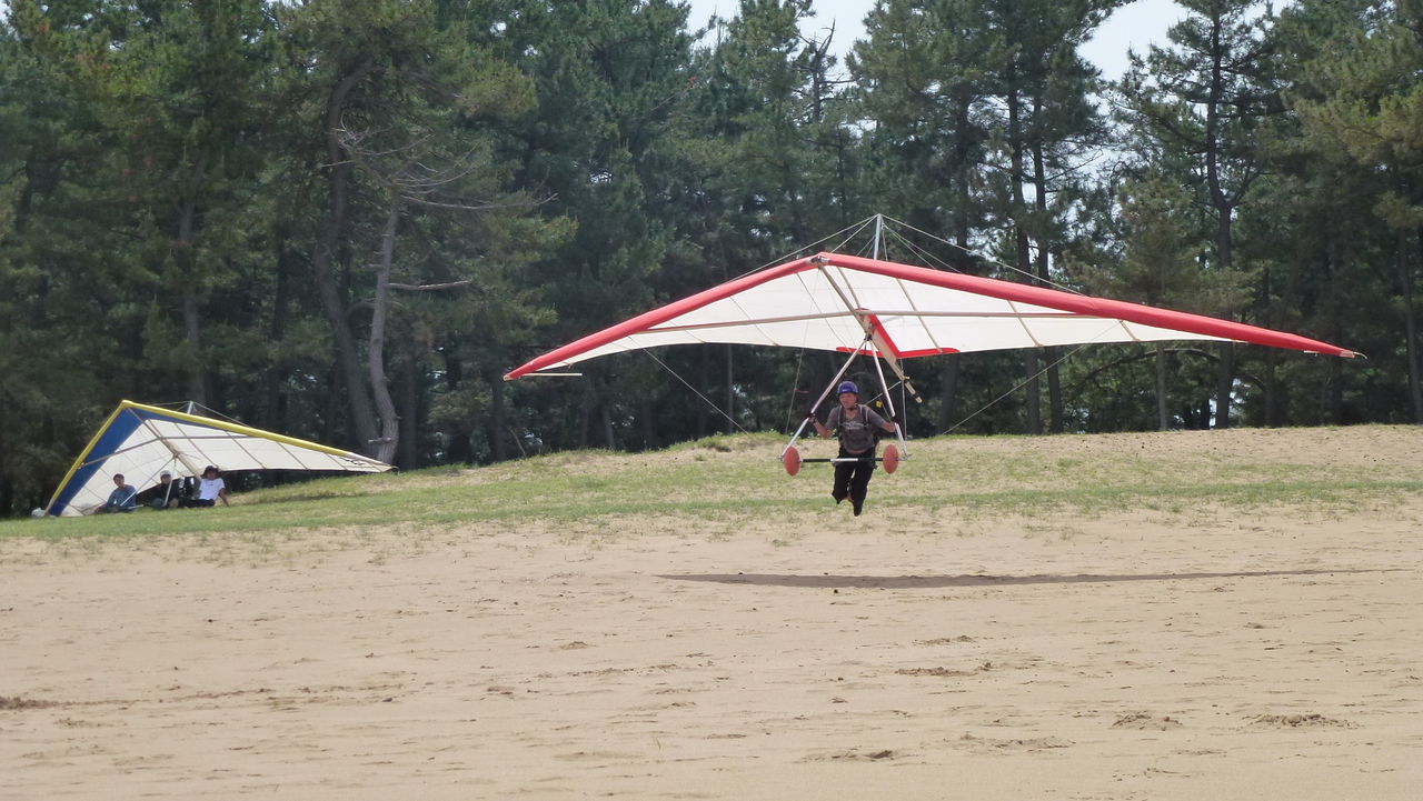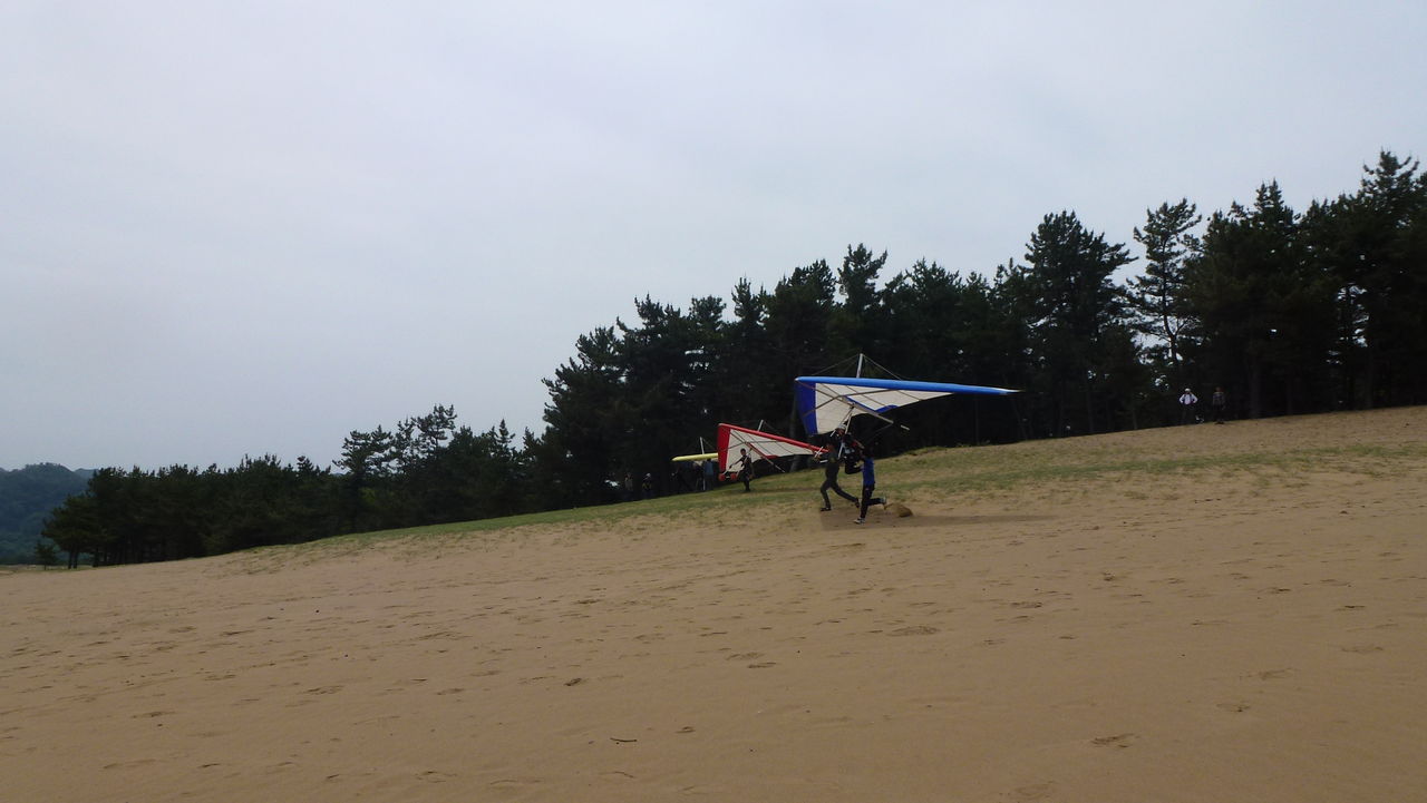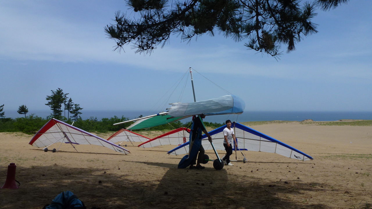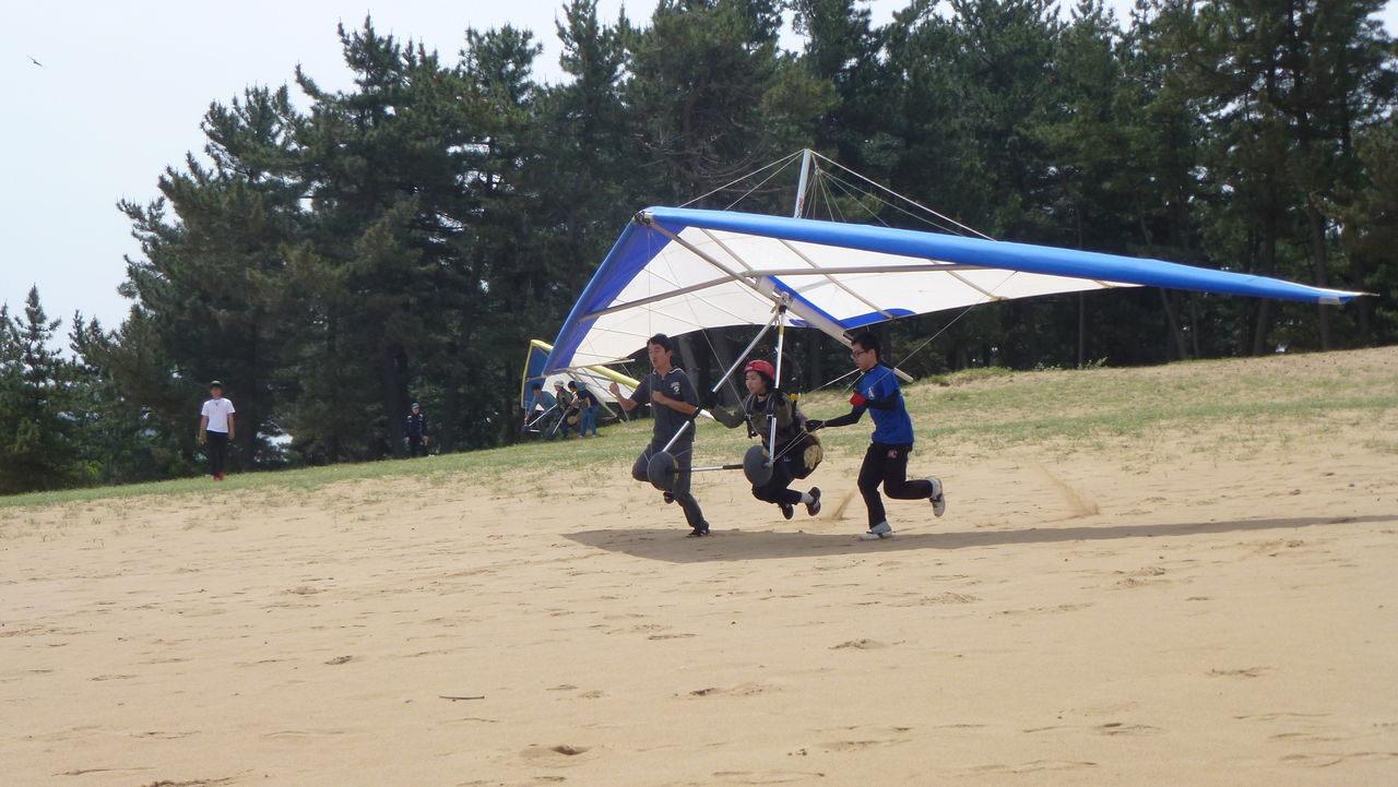 5/26。砂丘は良い感じの北東風。松林で練習。各自1本練習した頃から微妙な風に!?
