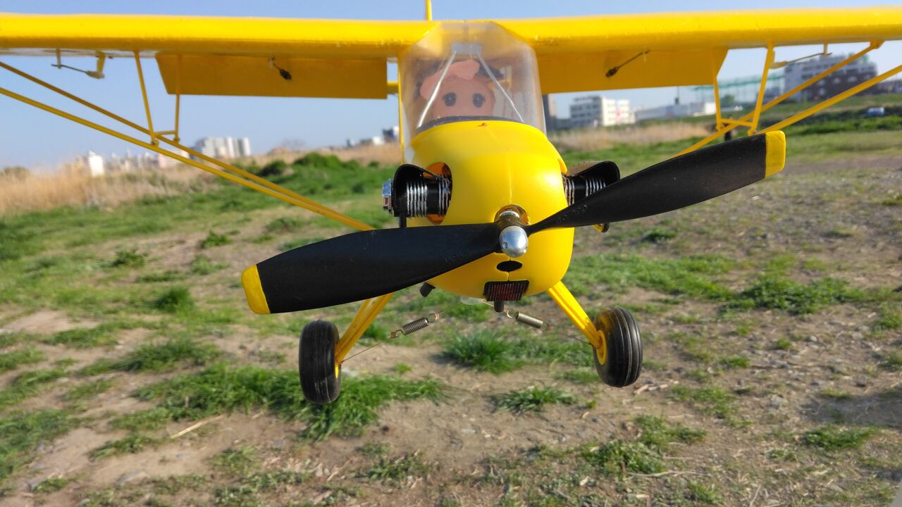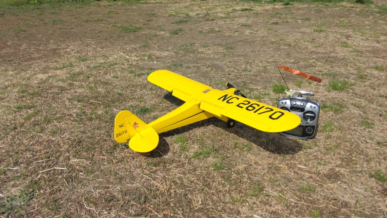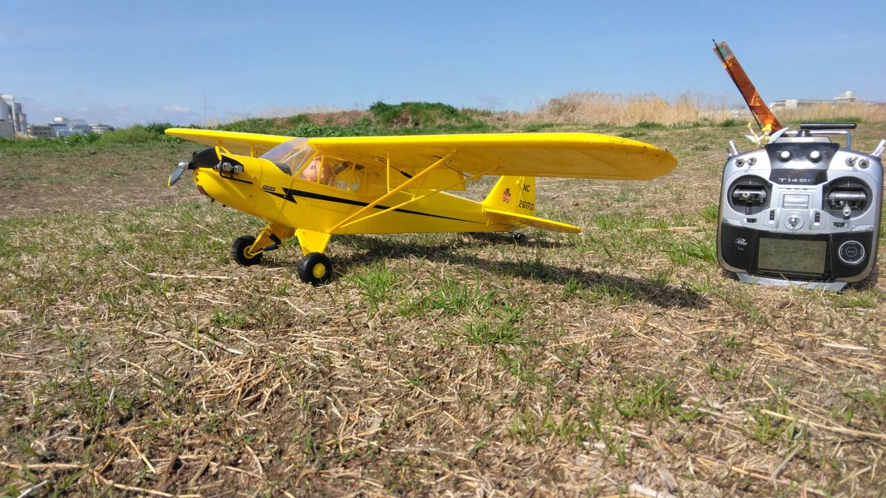 フラップの効果は??です 着陸進入速度はそれ程落とせませんでした 失速度特性が今一の関係でしょう 右翼に3gの錘を貼りました 着陸自体はタイヤが小さいので砂地・段差に勝てません